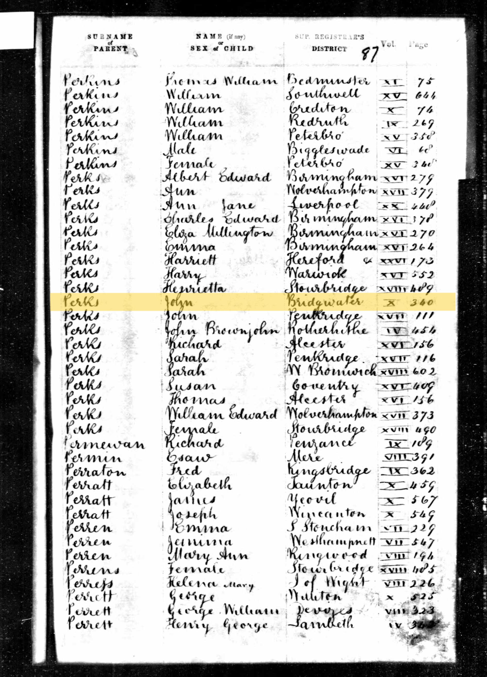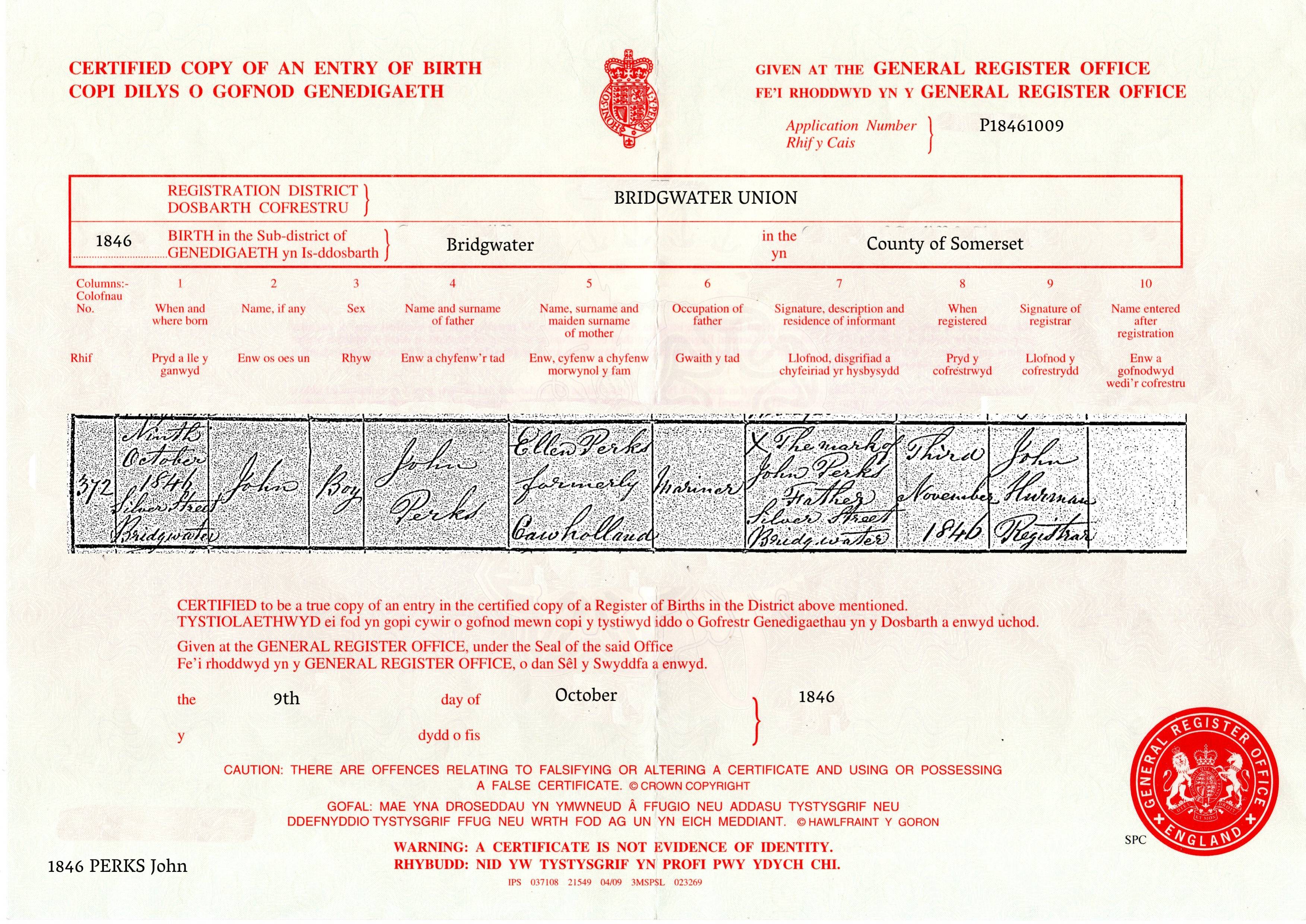 | Father | PERKS John, b. 1823, BRIDGWATER, Somerset, England | |