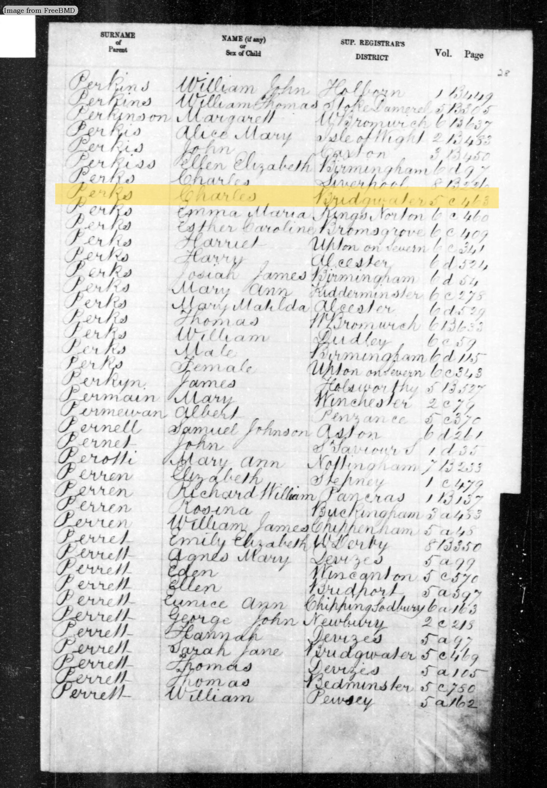 | Father | PERKS John, b. 1823, BRIDGWATER, Somerset, England | |