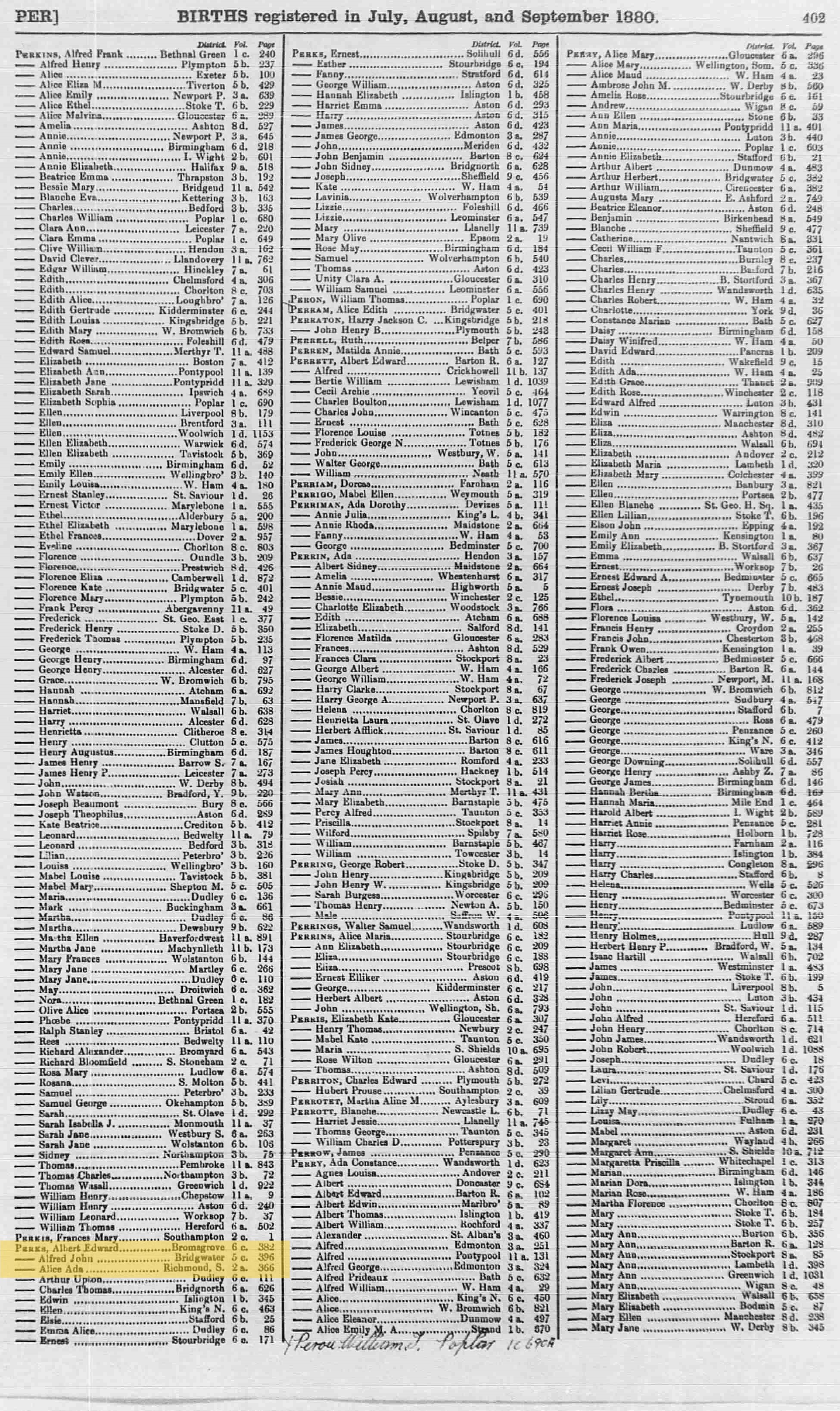 | Father | PERKS Henry, b. 22 Feb 1852, Monmouth Street, BRIDGWATER, Somerset, England | |