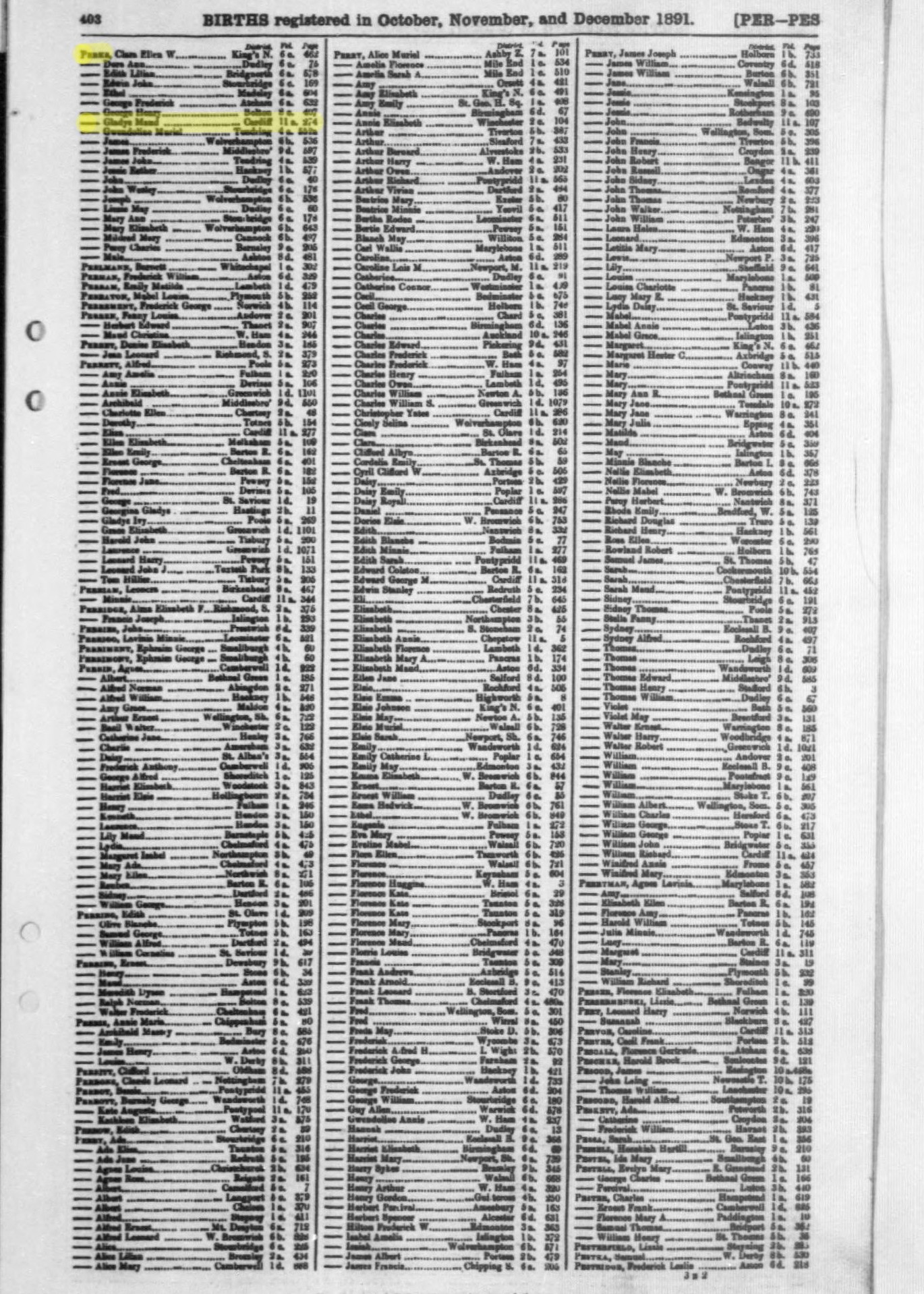 | Civil Birth | Q4 1891 | CARDIFF, Glamorgan, Wales [1, 2] |