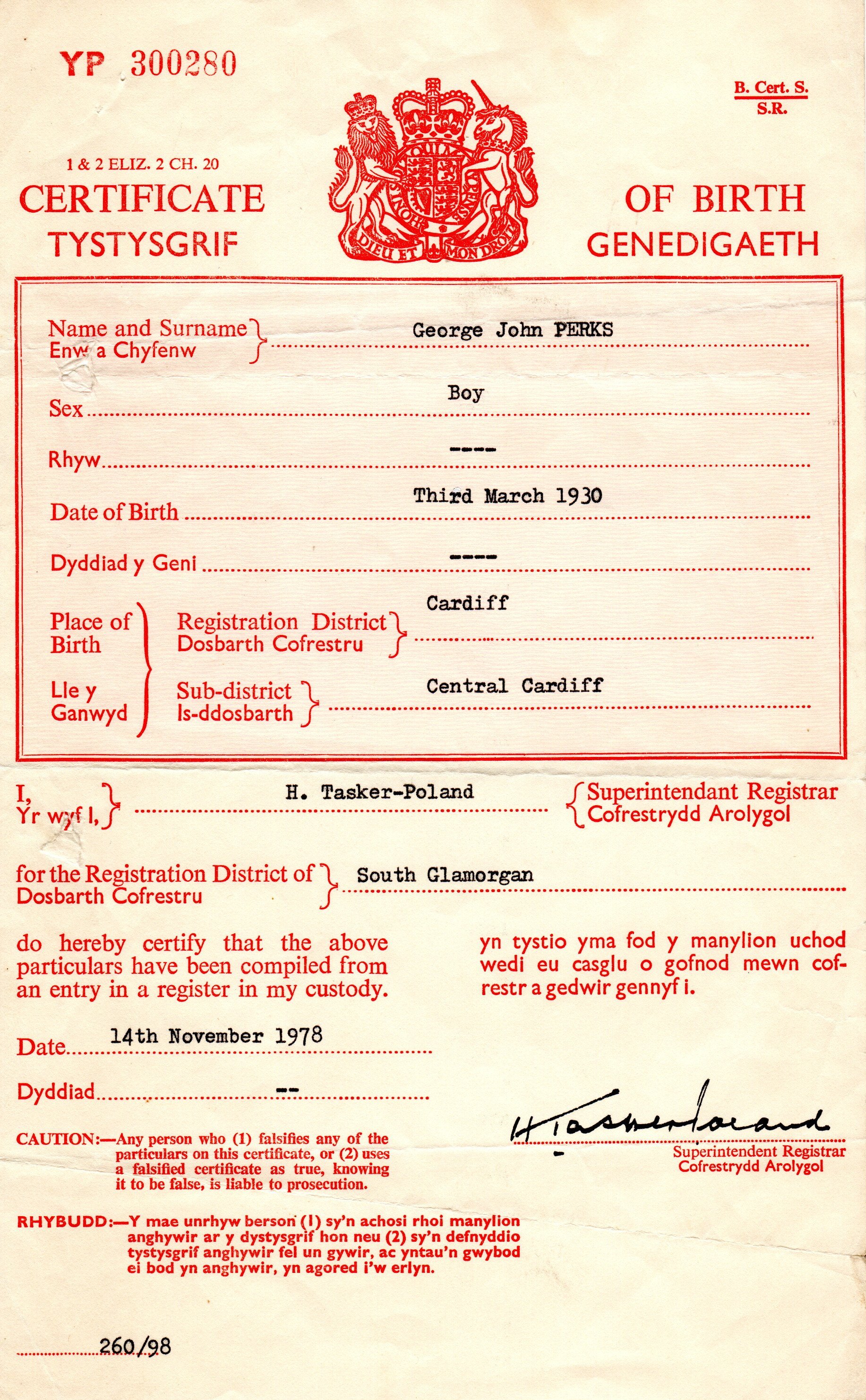 George J Perks in 1930 England Wales Births 1837-2006 Cardiff, Glamorganshire, Wales