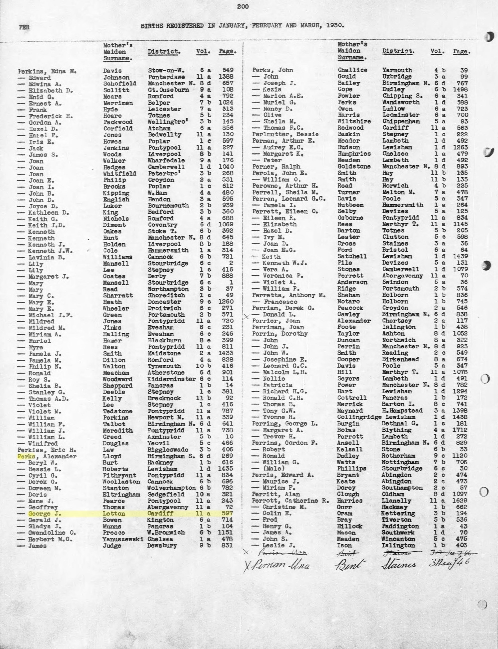 Birth Q1 1930 PERKS George J Letton Cardiff 11a 597