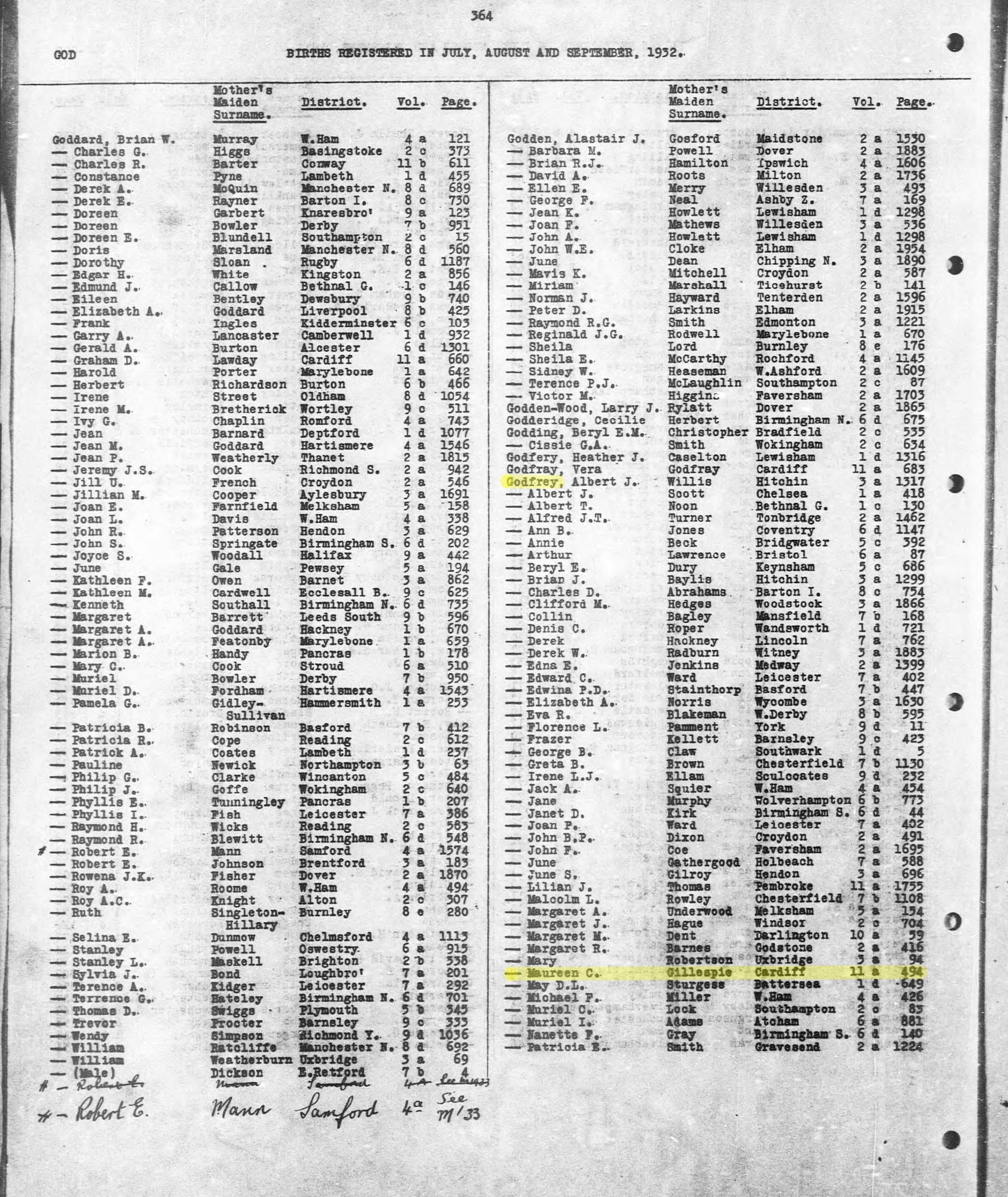 Birth Q3 1932 GODFREY Maureen C Gillespie Cardiff 11a 494